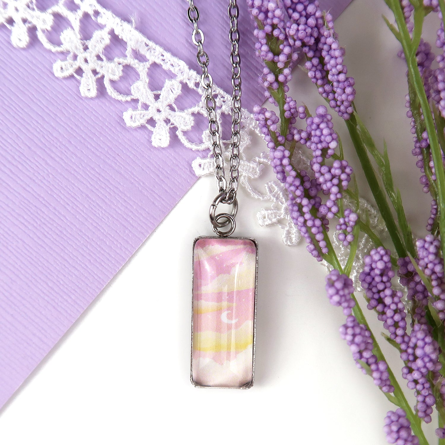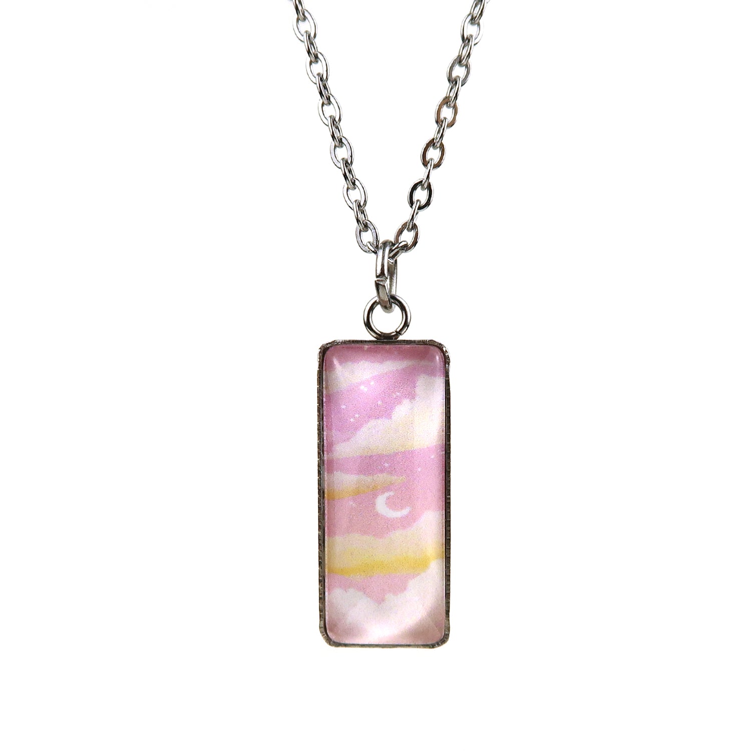 This necklace is a recreation of a dreamy pink sunset with a very small crescent moon right in the middle and lots of fluffy clouds.