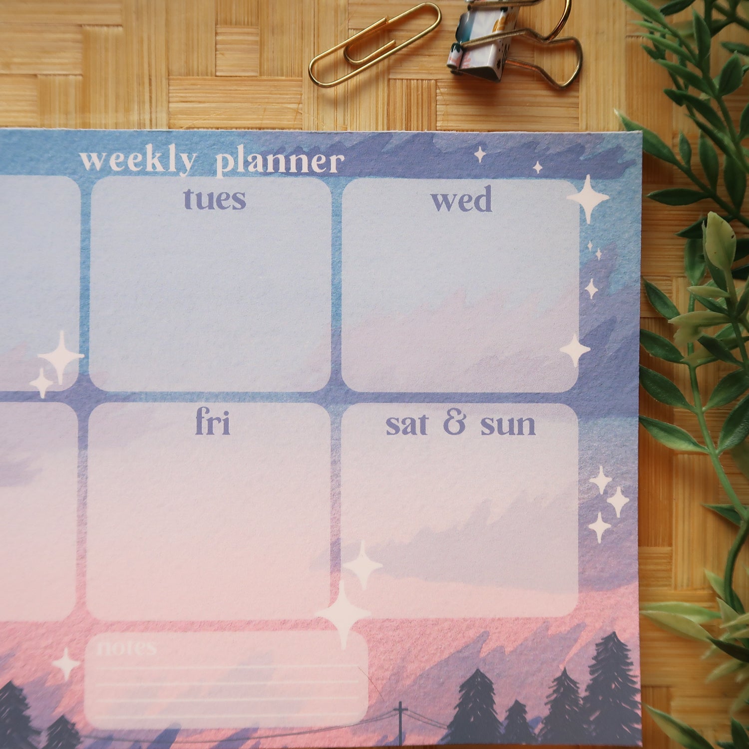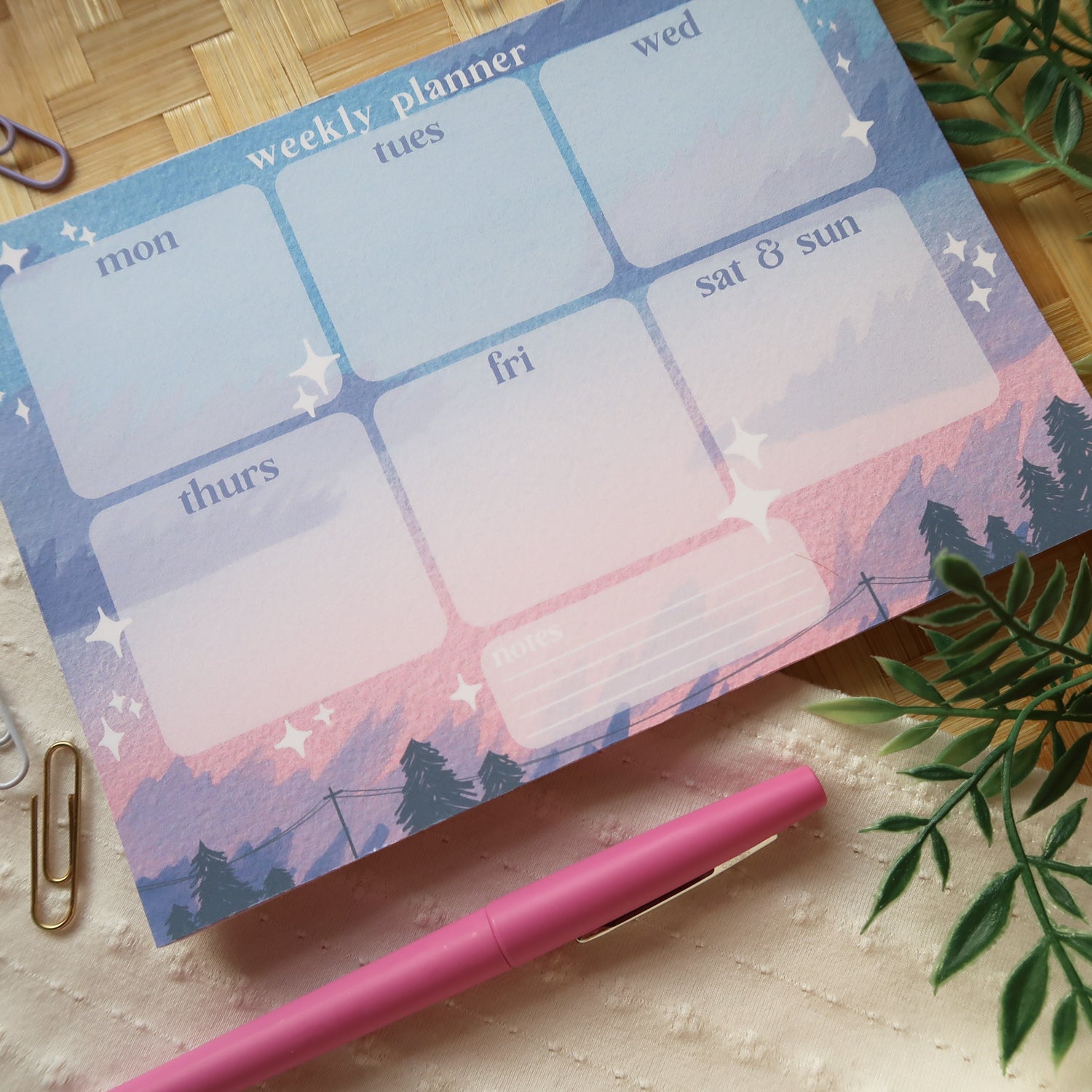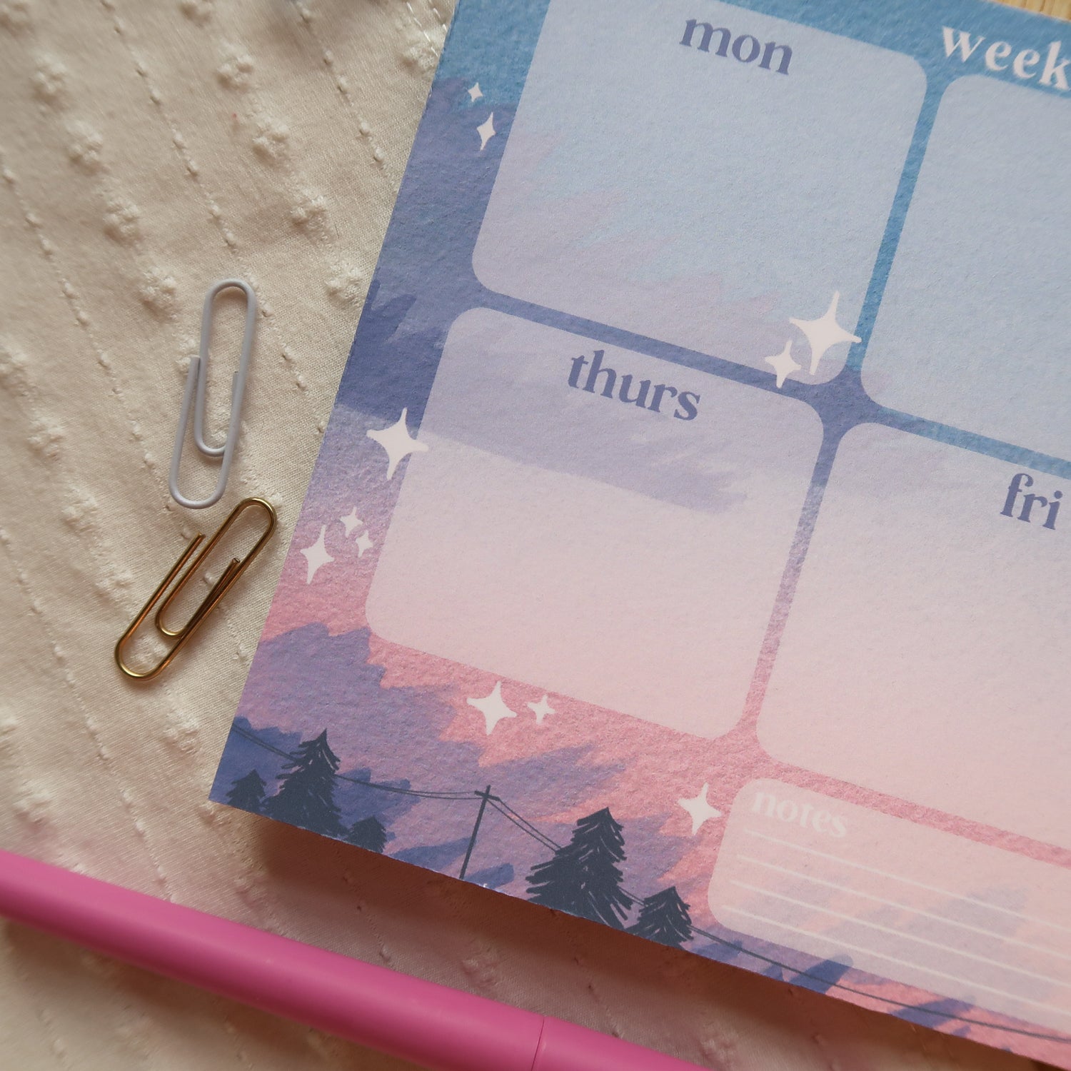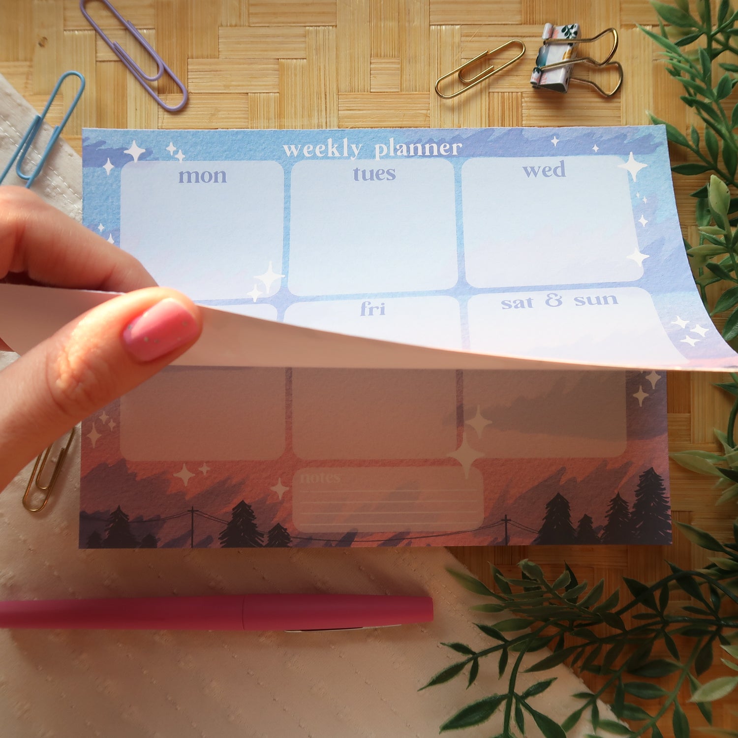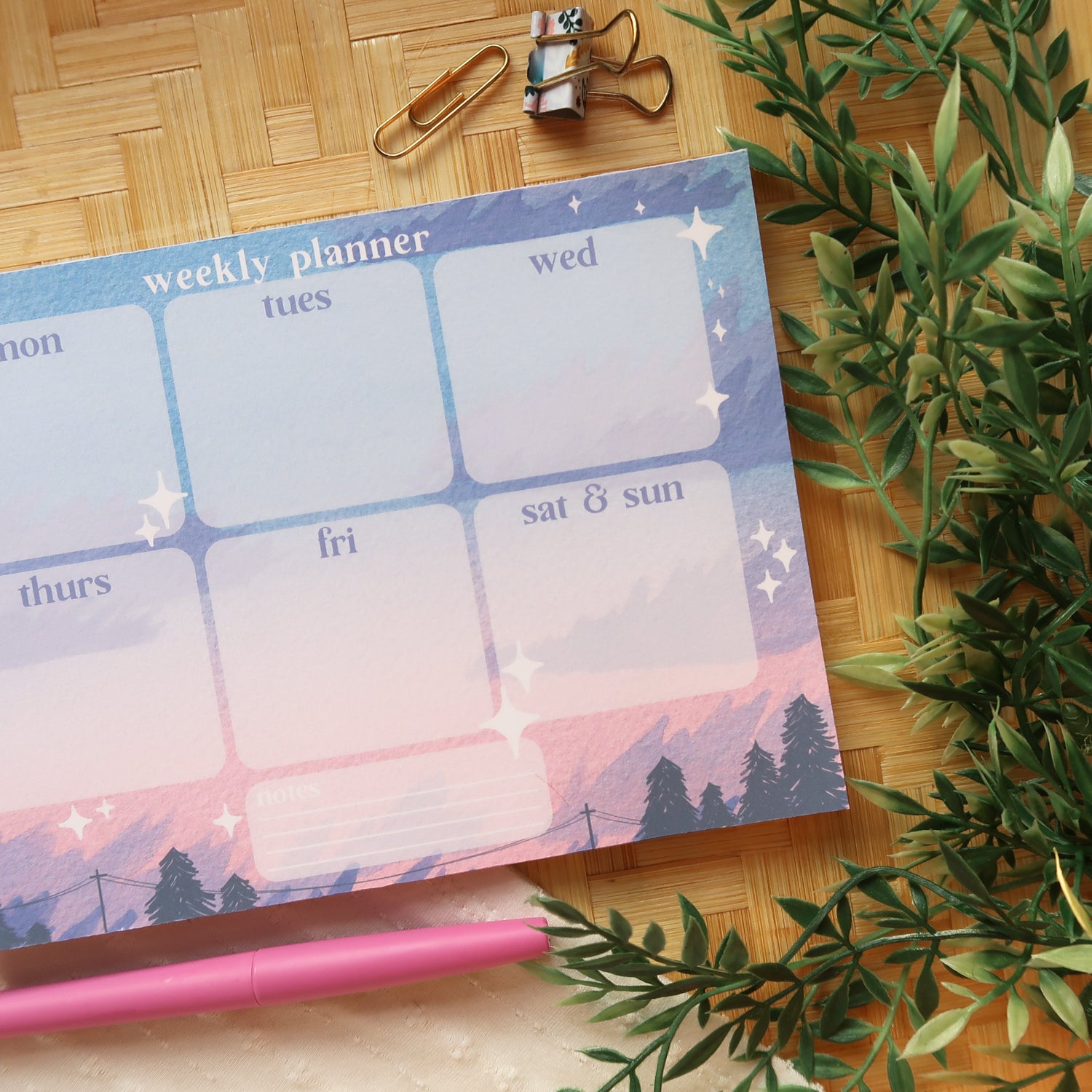 This handmade weekly planner tear off pad has a horizontal setup and measures 7 inches wide by 5 inches tall and has 30 sheets of acid free 162gsm paper backed by a sturdy piece of cardstock to ensure your paper won't bend in transit or when it gets knocked off your desk.