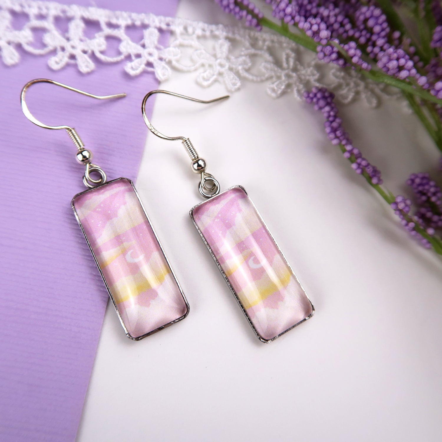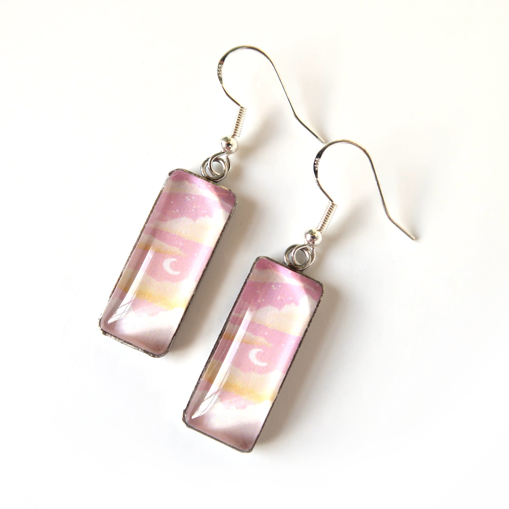 These pretty pink sky earrings will add a bit of art to any outfit!