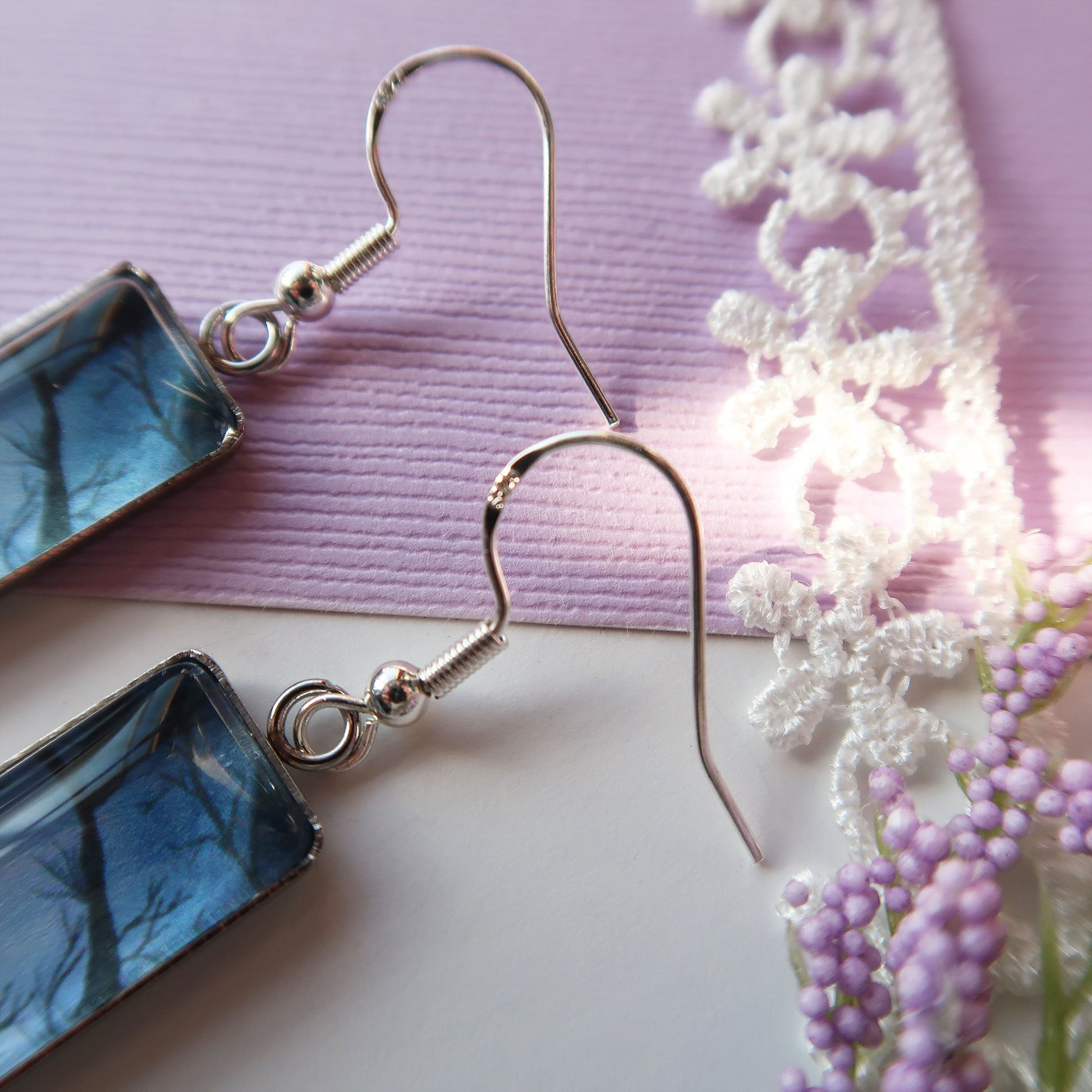 Each pair of earrings is lovingly handmade by me in my home studio by attaching small glass cabochons to miniature prints of my own artwork.