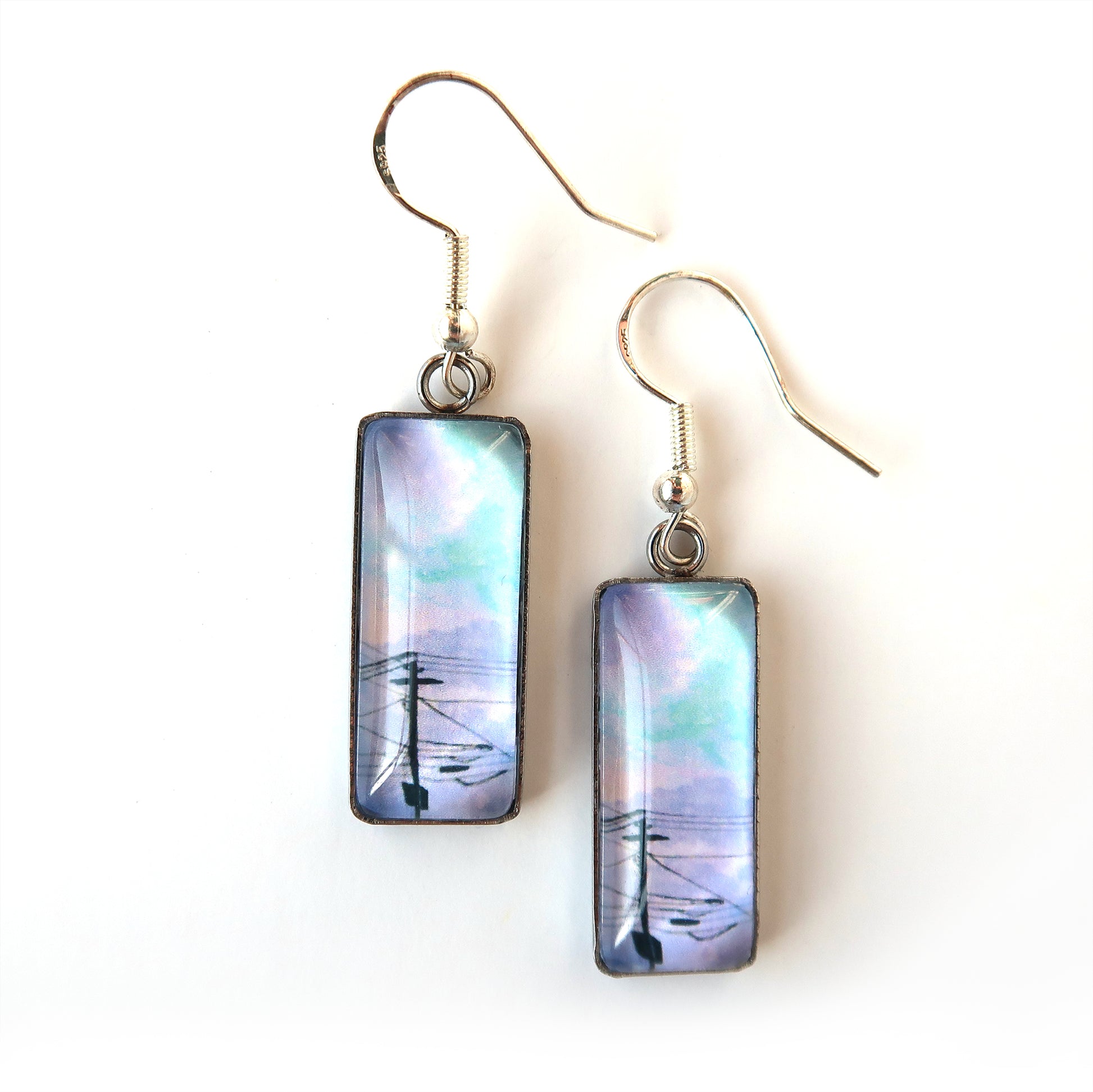 Purple Clouds and Powerlines Rectangle Dangle Earrings