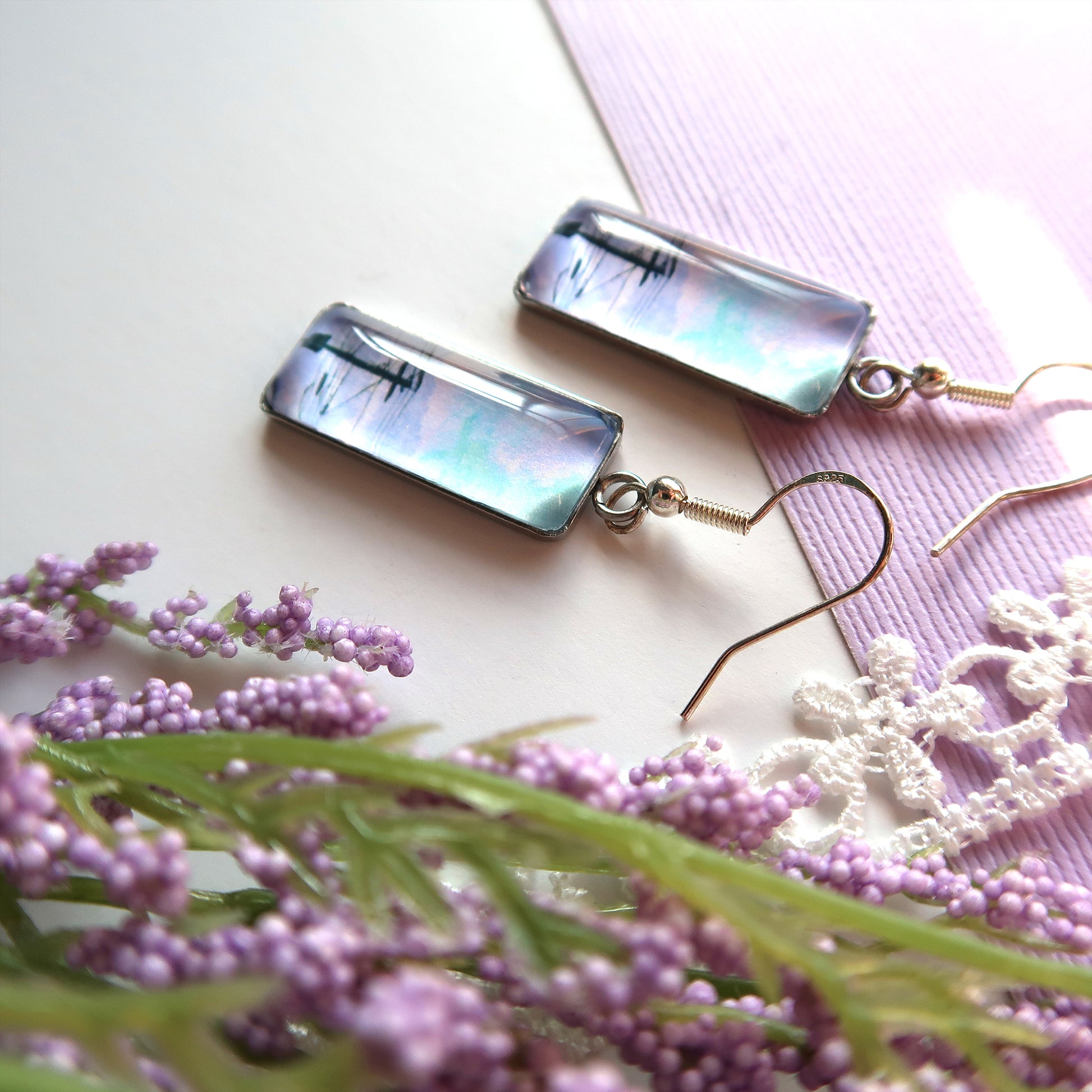 Each pair of earrings is lovingly handmade by me in my home studio by attaching small glass cabochons to miniature prints of my own artwork.